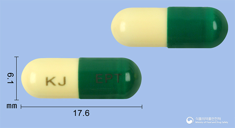 외형 정보: 이 약은 흰색 내지 미백색의 분말 또는 과립이 충전된 상부 초록색, 하부 미황색의 경질캡슐제입니다. 모양은 장방형이며, 각인으로 ‘KJ EPT’가 새겨져 있습니다.