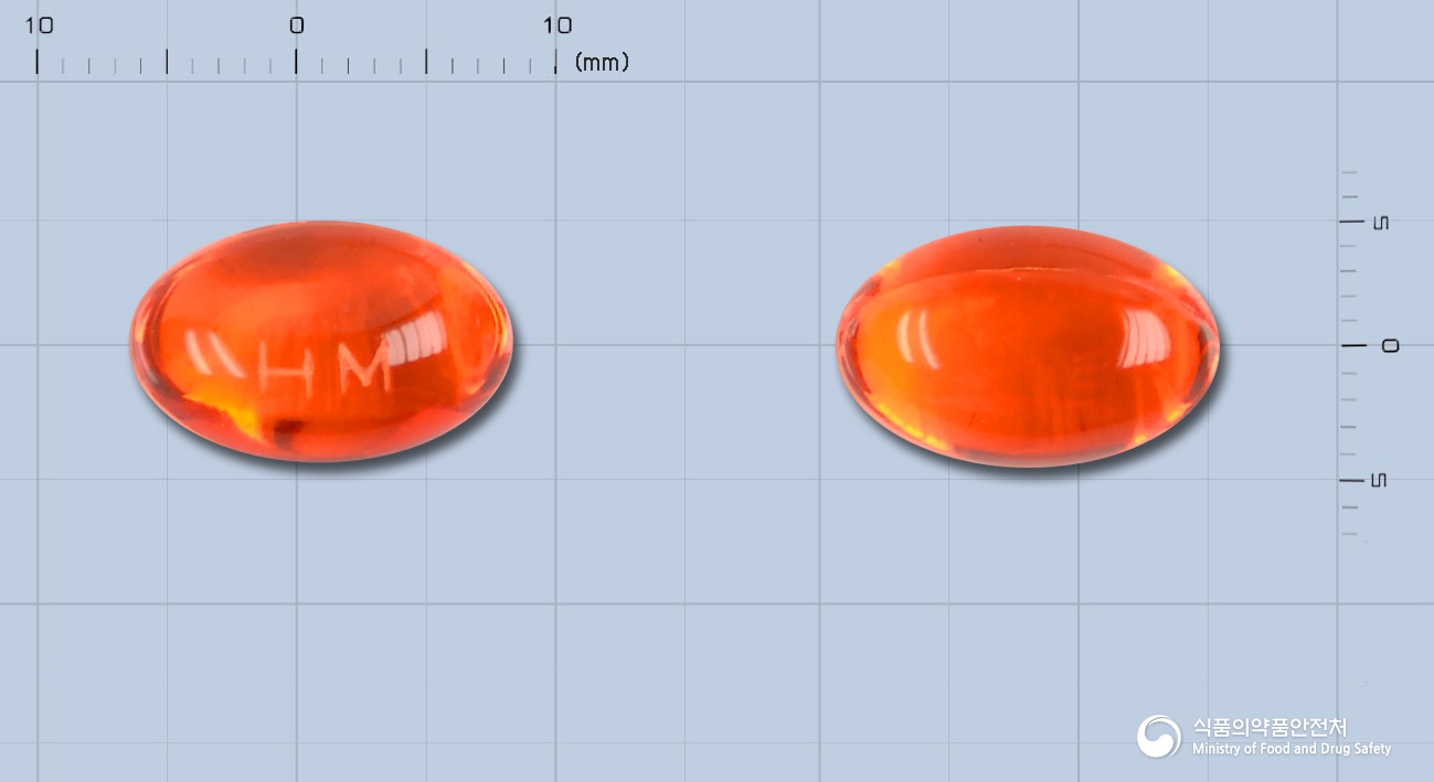 - 성상: 무색 내지 주황색의 점조성액이 들어있는 주황색의 투명한 타원형 연질캡슐제