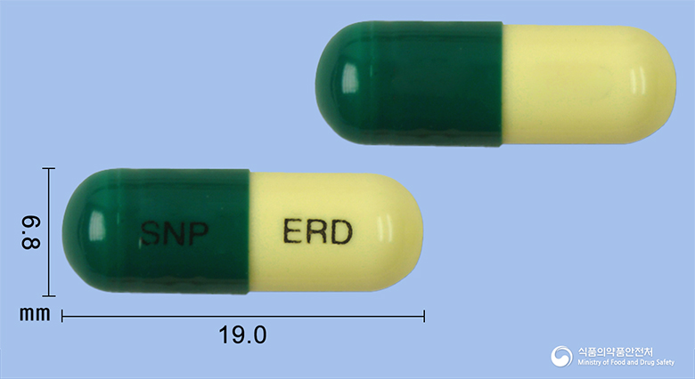 - 성상: 백색 내지 미백색의 분말 또는 과립이 충전된 상부 초록색, 하부 미황색의 경질캡슐제