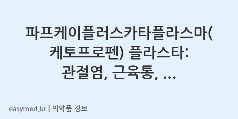 오늘은 다양한 근골격계 통증에 효과적인 의약품, ‘파프케이플러스카타플라스마(케토프로펜)’에 대해 자세히 알아보겠습니다. 이 제품은 퇴행성관절염, 어깨관절주위염, 근육통, 외상 후 부기 및 통증 등 여러 증상 완화에 도움을 주는 플라스타(첩부제) 형태의 진통소염제입니다. 정확한 정보와 안전한 사용법을 지금부터 함께 확인해 보시죠!