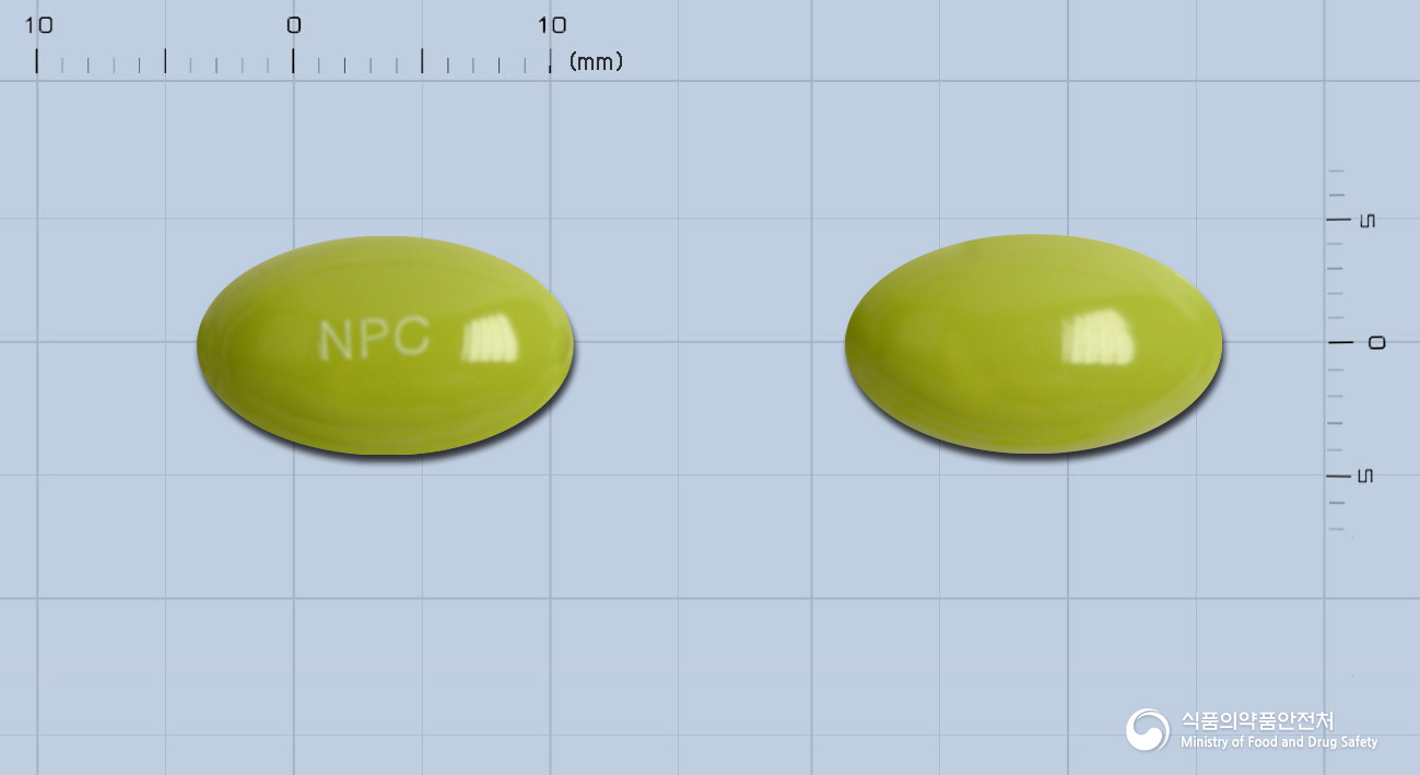 - 외형: 미황갈색 내용물이 충진된 연두색 타원형 연질캡슐입니다.
