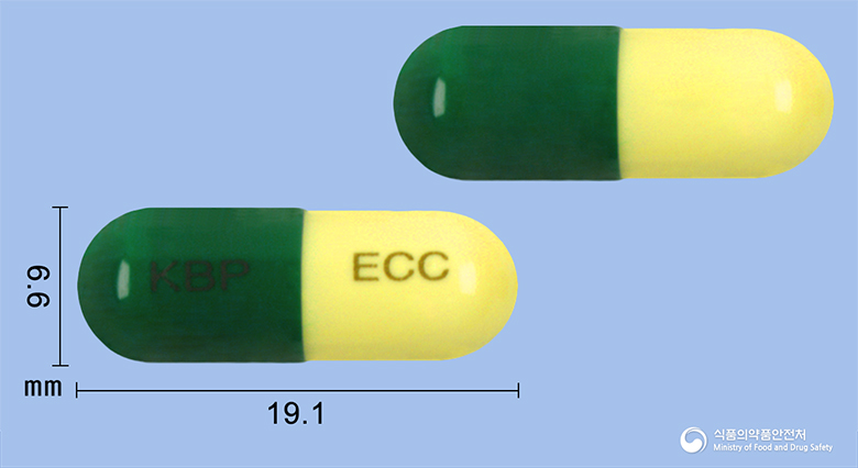 외형 정보: 흰색∼유백색의 결정성 분말이 들어있는 상부 초록색, 하부 노란색의 장방형 경질캡슐제이며, ‘KBP ECC’ 각인이 있습니다.