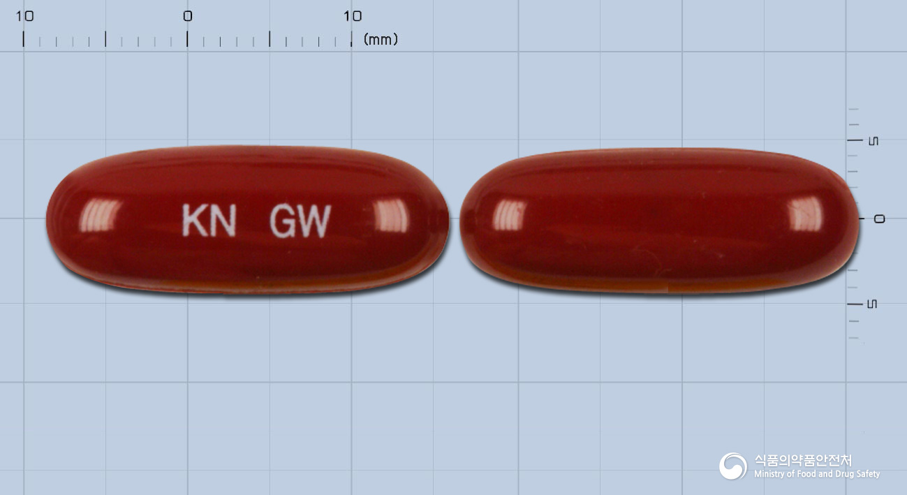 - 제형: 적갈색의 내용물을 함유한 암적색의 장방형 연질캡슐
