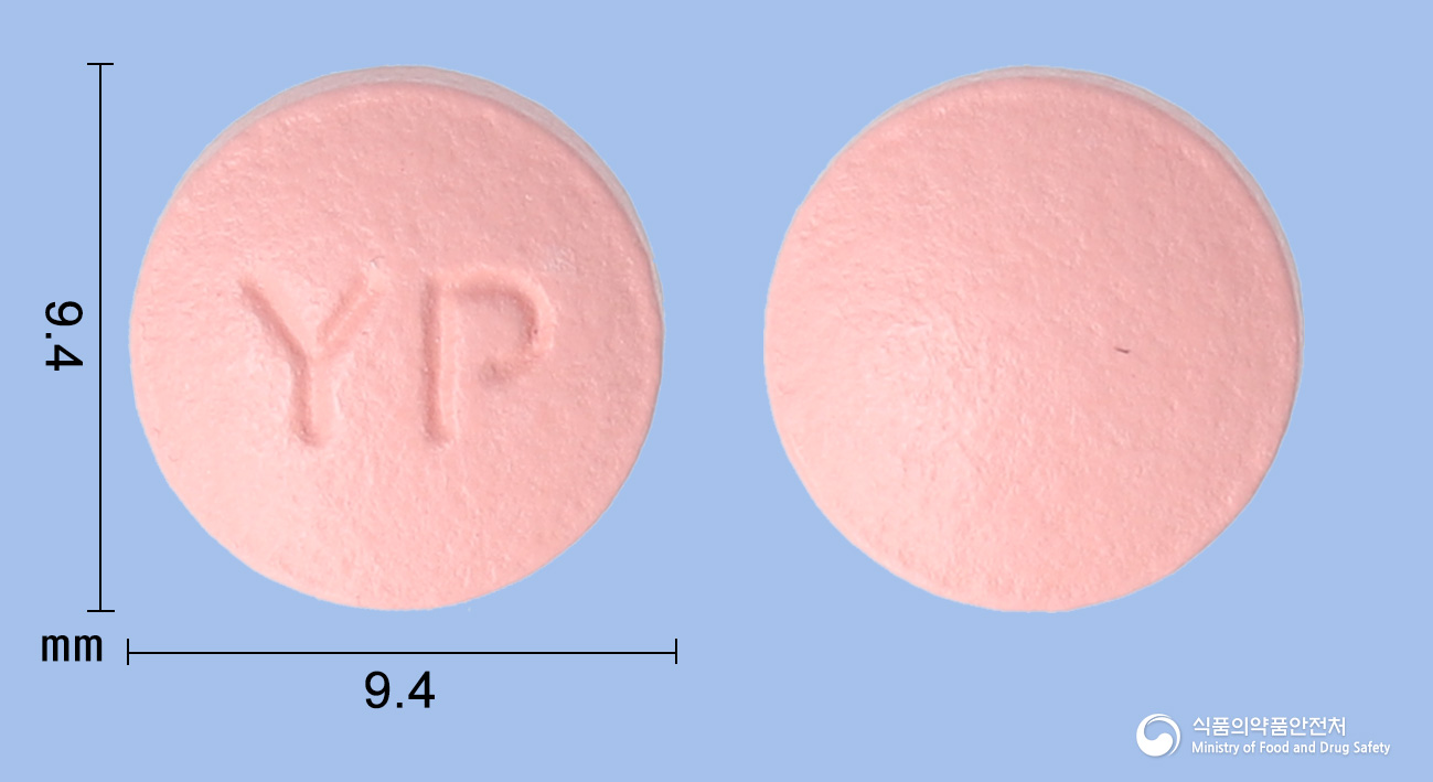 외형 정보: 브로다제장용정은 분홍색의 원형 장용성 필름코팅정이며, 약의 한 면에는 ‘YP’ 각인이 되어 있습니다.