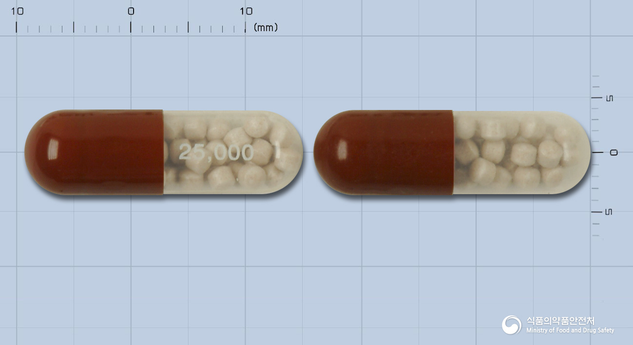 성상: 독특한 향의 회백색 장용성 제피정을 함유하는 상부 불투명 갈색, 하부 투명한 무색의 경질캡슐