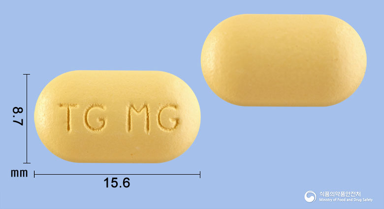 외형 정보: 연한 노란색의 장방형 장용성 필름코팅정이며, 앞면에는 ‘TG’, 뒷면에는 ‘MG’가 각인되어 있습니다.