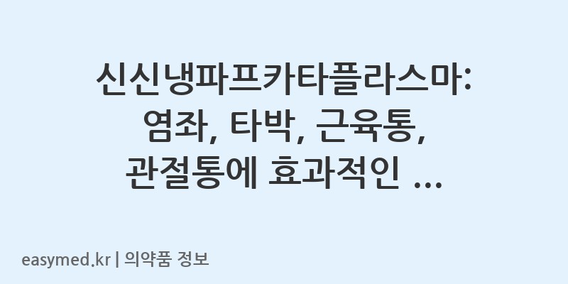 안녕하세요! 꼼꼼하고 전문적인 약사 블로거입니다. 오늘은 다양한 통증 완화에 도움을 주는 신신제약의 ‘신신냉파프카타플라스마’에 대해 자세히 알아보겠습니다. 갑작스러운 염좌, 타박상, 혹은 만성적인 근육통과 관절통으로 불편함을 느끼실 때 시원하게 통증을 가라앉히는 데 효과적인 제품입니다. 올바른 사용법과 주의사항을 함께 확인하여 건강한 통증 관리에 도움이 되시길 바랍니다.