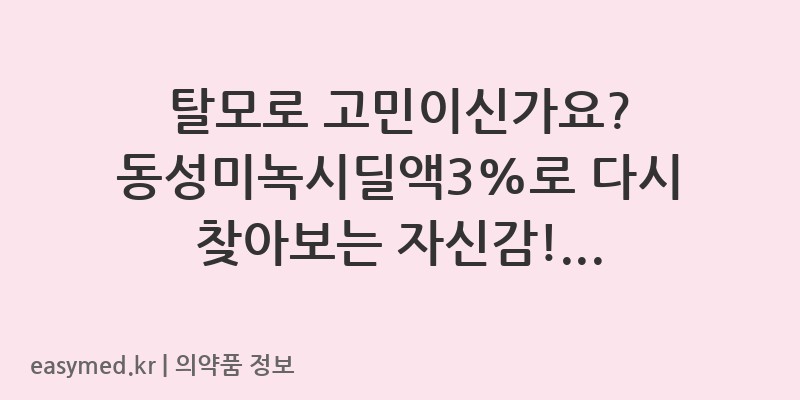 안녕하세요! 여러분의 건강한 삶을 응원하는 약사 블로거입니다. 오늘은 남성형 및 여성형 탈모증 치료에 사용되는 의약품, 동성미녹시딜액3%에 대해 자세히 알아보겠습니다. 탈모로 인해 자신감을 잃고 고민이 많으셨던 분들께 유용한 정보가 되기를 바랍니다.