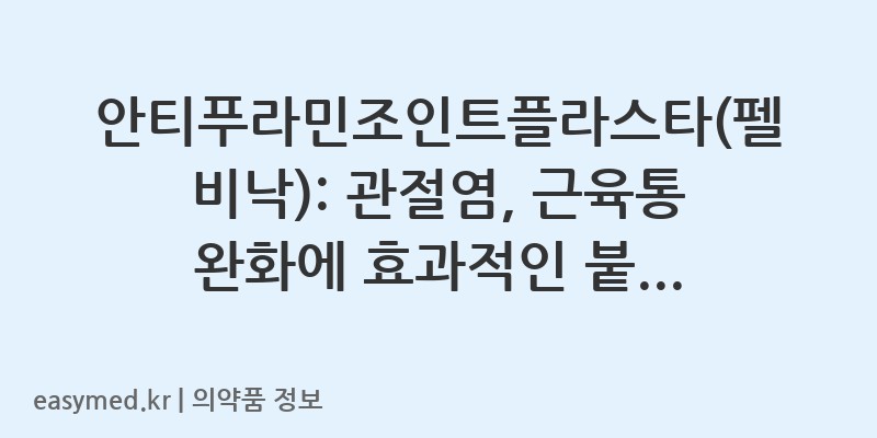 (주)유한양행의 안티푸라민조인트플라스타(펠비낙)는 관절염, 어깨관절주위염, 근육통 등으로 인한 통증과 염증을 완화하는 데 사용되는 붙이는 파스 형태의 의약품입니다. 비스테로이드성 소염진통제(NSAIDs) 계열인 펠비낙 성분을 함유하여, 환부에 직접 작용하여 통증을 줄이고 염증을 가라앉히는 효과를 나타냅니다. 이 포스팅에서 안티푸라민조인트플라스타(펠비낙)의 자세한 효능, 올바른 용법·용량, 그리고 반드시 알아두셔야 할 주의사항들을 꼼꼼하게 살펴보겠습니다.