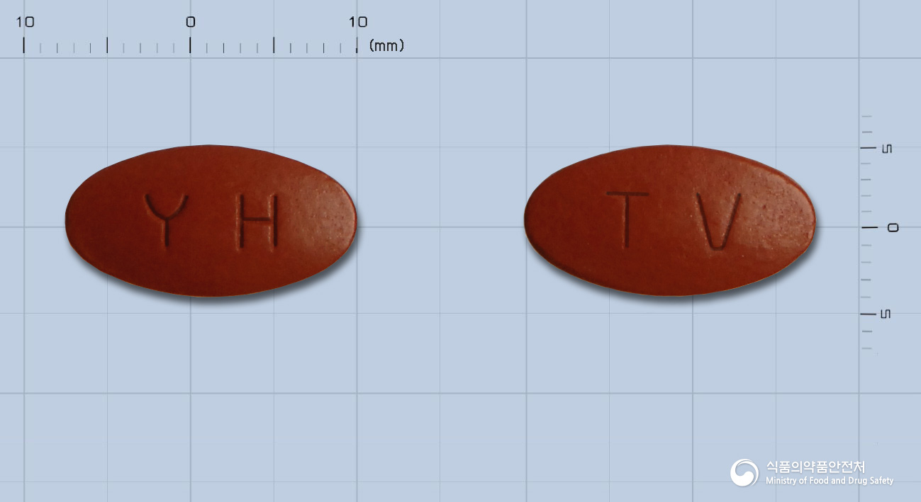 외형 정보: 트루비타정은 적갈색의 타원형 필름코팅정으로, 앞면에는 ‘YH’ 각인이 새겨져 있습니다.