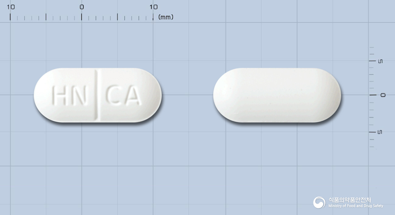 외형: 흰색의 장방형 정제 (각인: HN분할선CA)