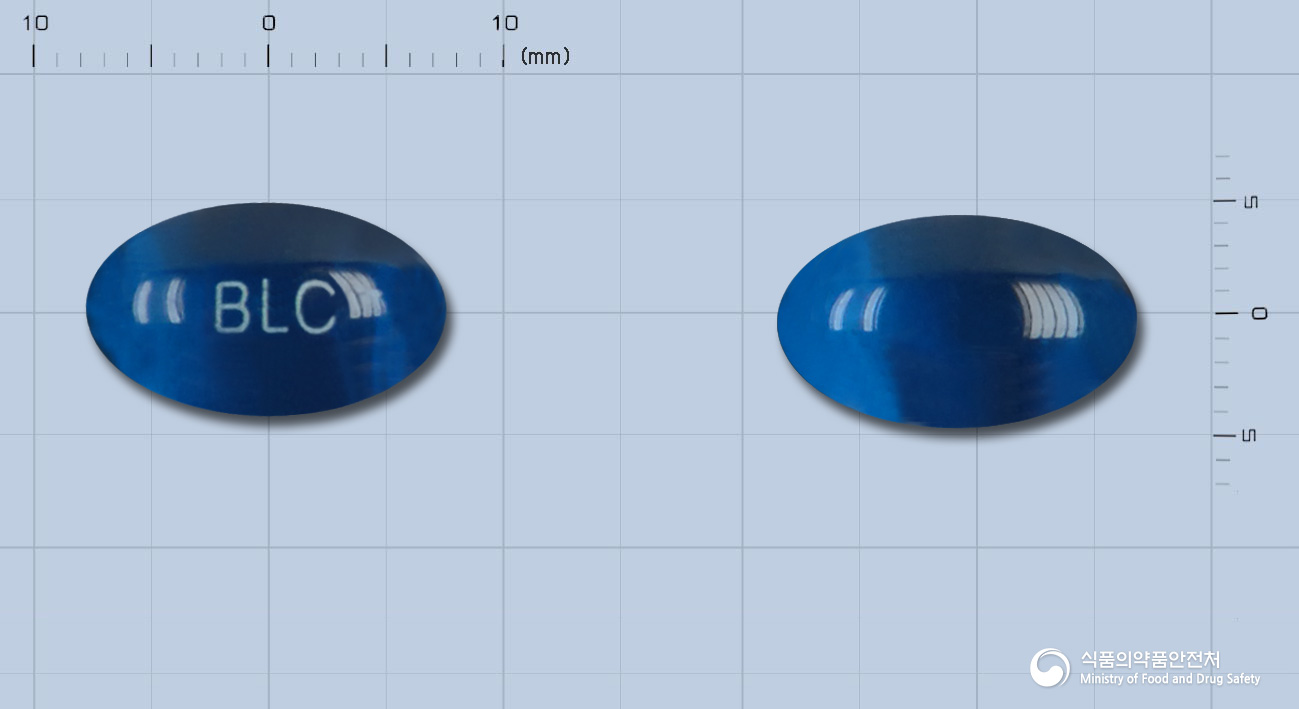 이 약은 무색 내지 연한 청색의 내용물을 함유한 진한 청색의 투명한 타원형 연질캡슐입니다.