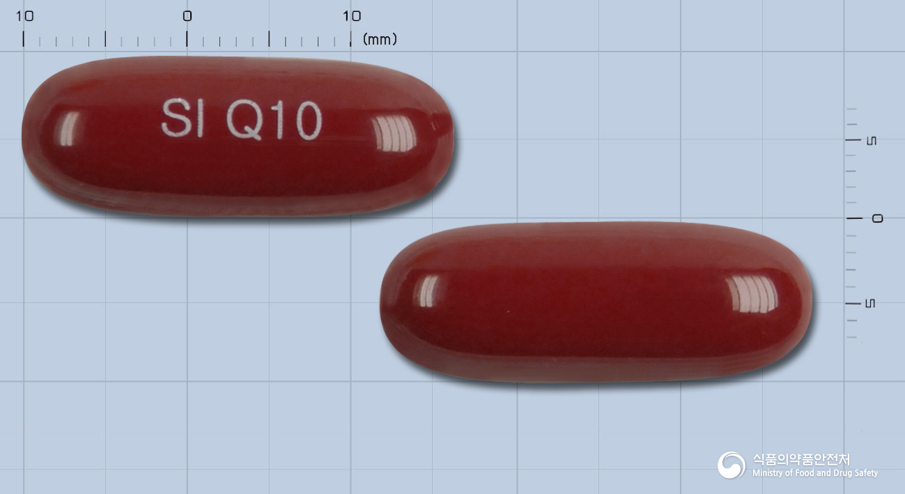 큐텐훌연질캡슐은 노란색 유상체가 충전된 어두운 적색의 불투명 장방형 연질캡슐제입니다. (모양: 장방형, 색상: 갈색, 각인: SI Q10)