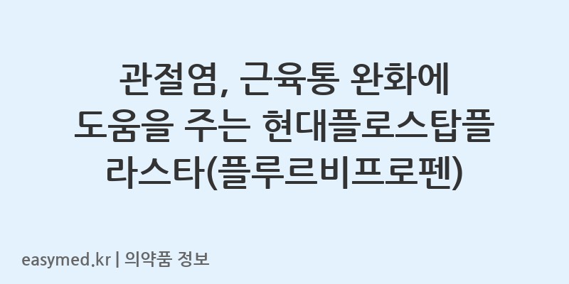 안녕하세요, 꼼꼼한 약사 블로거입니다. 오늘은 퇴행성관절염, 어깨관절주위염, 근육통 등 다양한 통증 완화에 효과적인 현대약품(주)의 ‘현대플로스탑플라스타(플루르비프로펜)’에 대해 자세히 알아보겠습니다. 통증으로 불편함을 겪고 계시다면 이 포스팅이 도움이 되실 것입니다.