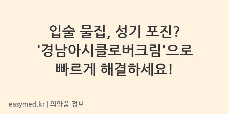 안녕하세요! 꼼꼼한 약사 블로거입니다. 오늘은 단순포진 바이러스 감염으로 인한 물집 증상으로 불편을 겪는 분들을 위한 외용제, ‘경남아시클로버크림’에 대해 자세히 알아보겠습니다. 효과적인 사용법과 꼭 알아두어야 할 주의사항까지 함께 살펴볼까요?