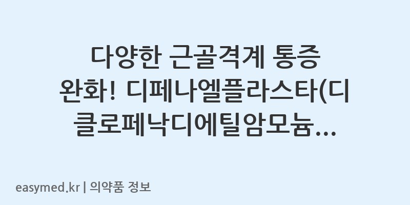 안녕하세요, 꼼꼼한 약사 블로거입니다. 오늘은 아이큐어(주)에서 제조한 ‘디페나엘플라스타(디클로페낙디에틸암모늄)’에 대해 자세히 알아보겠습니다. 이 약은 통증과 염증 완화에 효과적인 외용제입니다. 정확한 사용을 위해 효능, 용법, 주의사항 등을 꼼꼼히 확인하시기 바랍니다.