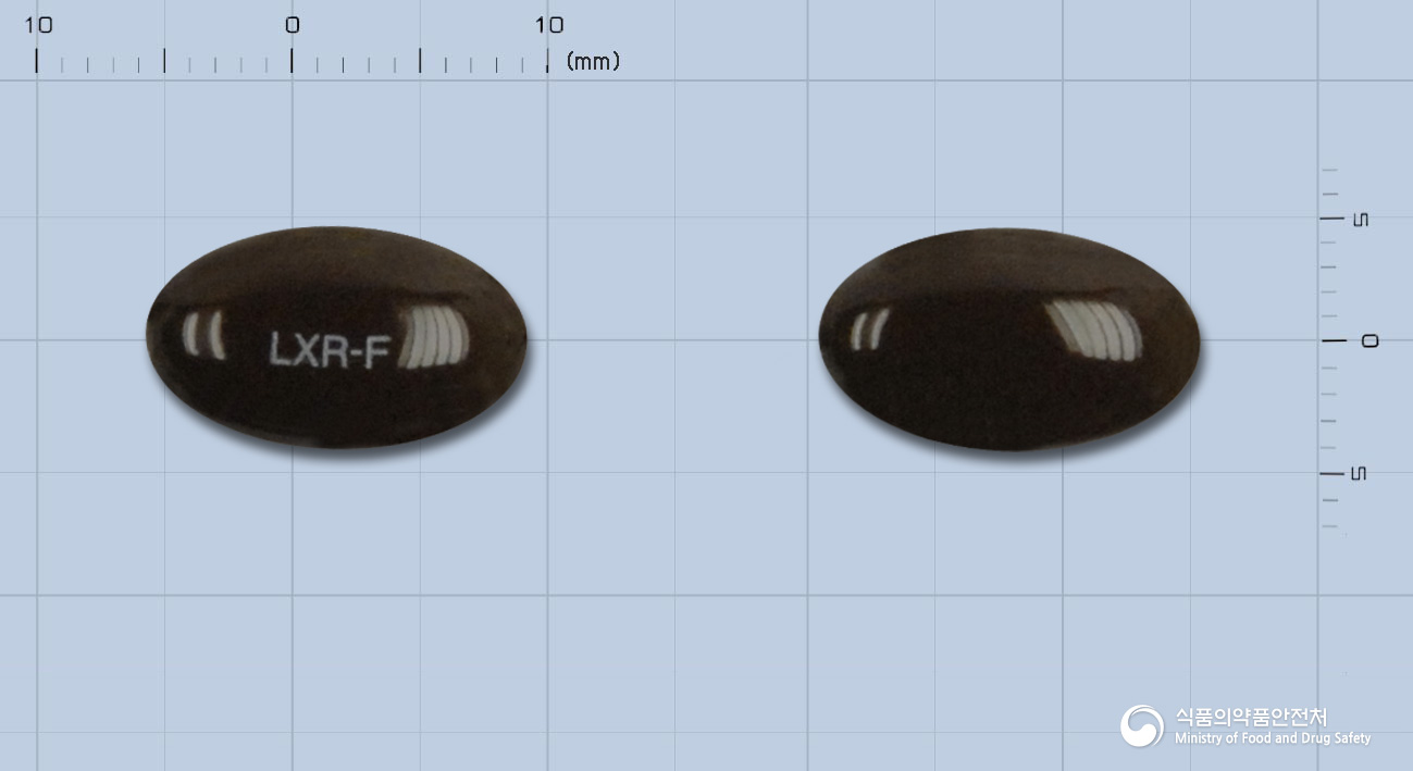 룩스린에프연질캡슐은 연두색의 유상물질이 들어있는 암갈색의 타원형 연질캡슐제입니다. 모양은 타원형이며, 색상은 갈색입니다. 캡슐에는 ‘LXR-F’가 각인되어 있습니다.