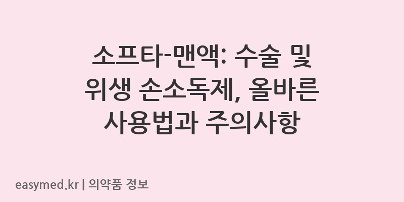 안녕하세요, 꼼꼼하고 전문적인 약사 블로거입니다. 오늘은 비브라운코리아(주)에서 제조한 손소독제 ‘소프타-맨액’에 대해 자세히 알아보겠습니다. 이 제품은 감염 예방을 위해 수술 전후 및 일상 위생 관리에 사용되는 중요한 손소독제입니다. 정확한 사용법과 주의사항을 숙지하시어 안전하고 효과적으로 사용하시기를 바랍니다.