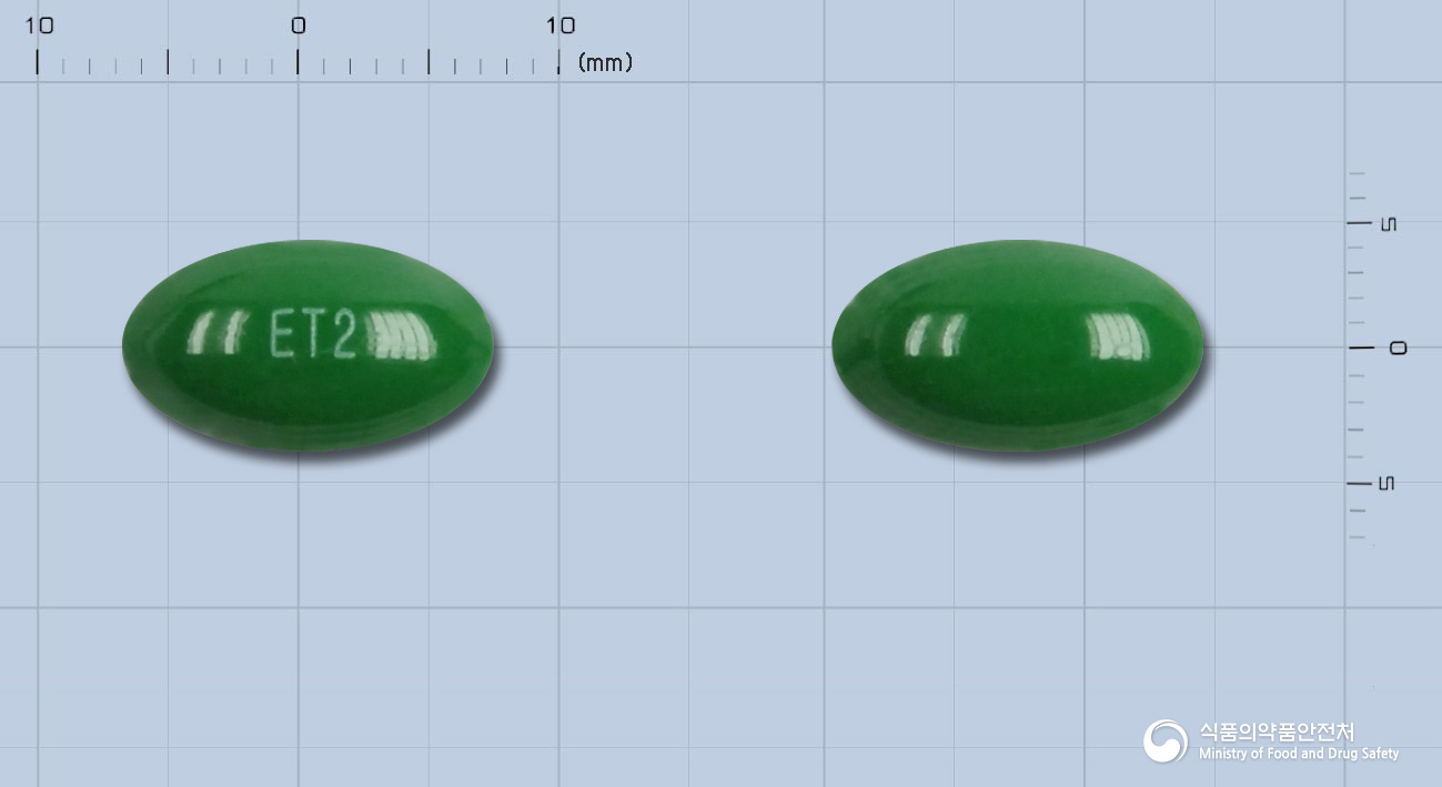 이 약은 녹색의 내용물을 함유한 녹색의 타원형 연질캡슐입니다.