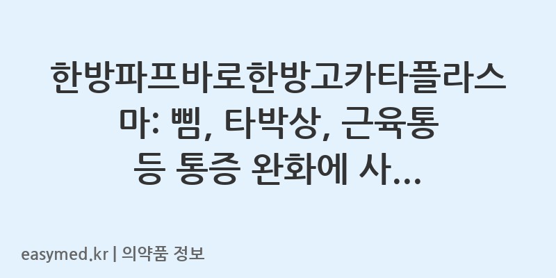 안녕하세요, 꼼꼼한 약사 블로거입니다. 오늘은 (주)티디에스팜에서 제조한 ‘한방파프바로한방고카타플라스마’에 대해 자세히 알아보겠습니다. 이 제품은 다양한 통증 및 염증 완화에 사용되는 한방 파스입니다. 정확한 효능, 용법, 그리고 사용 시 주의사항을 함께 살펴보겠습니다.