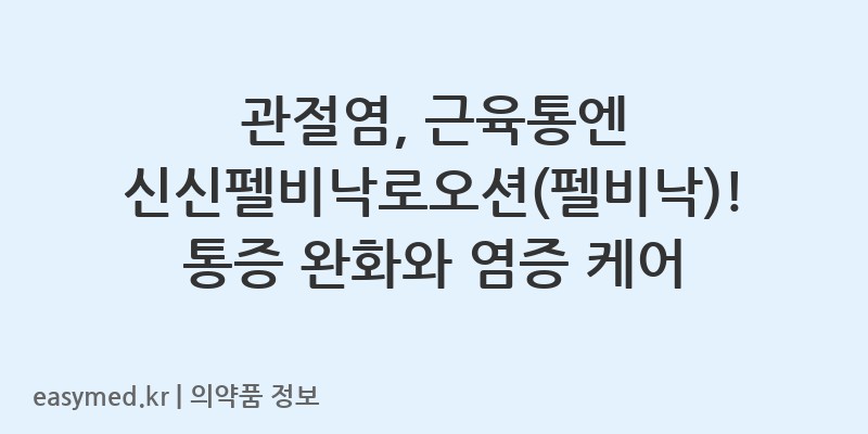 안녕하세요, 꼼꼼한 약사 블로거입니다. 오늘은 관절염, 근육통 등 다양한 통증 완화에 도움을 줄 수 있는 신신제약의 ‘신신펠비낙로오션(펠비낙)’에 대해 자세히 알아보겠습니다. 펠비낙 성분은 통증과 염증을 효과적으로 줄여주는 비스테로이드성 소염진통제(NSAIDs) 계열의 외용제입니다. 정확한 정보로 건강한 약 사용을 돕겠습니다.