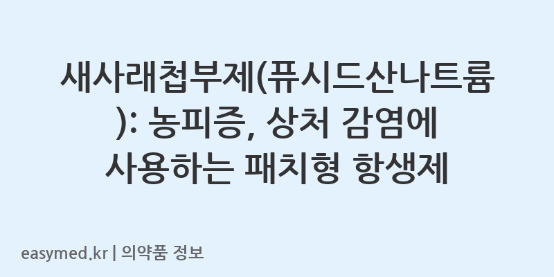 안녕하세요! 꼼꼼한 약사 블로거입니다. 오늘은 다양한 피부 감염에 효과적인 패치형 항생제, 신신제약의 새사래첩부제(퓨시드산나트륨)에 대해 자세히 알아보겠습니다. 이 약은 포도구균에 의한 농피증 및 외상, 화상 등으로 인한 2차 감염에 사용되는 치료제입니다.