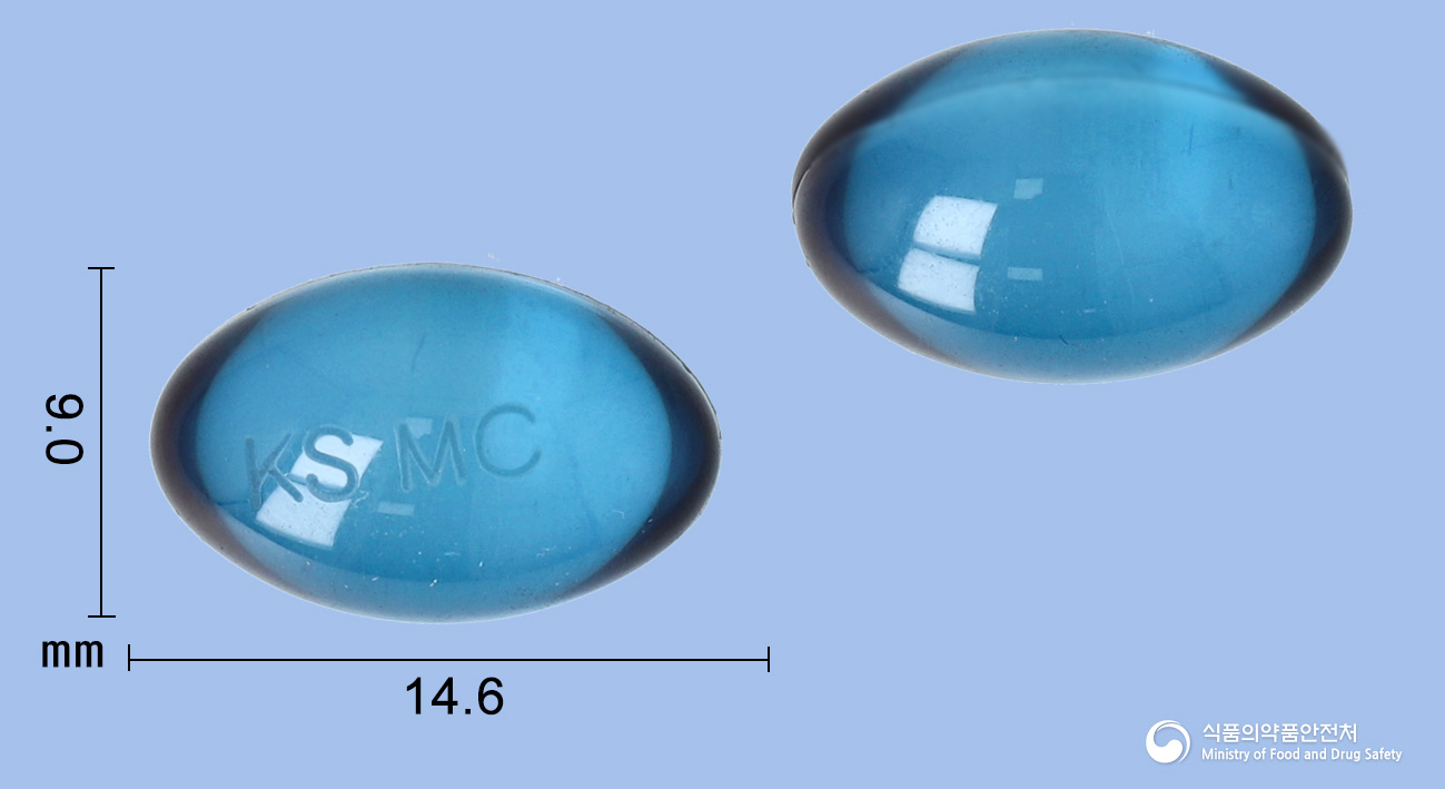 - 성상: 무색 내지 연한 청색의 투명한 내용물이 든 청색의 투명한 타원형 연질캡슐