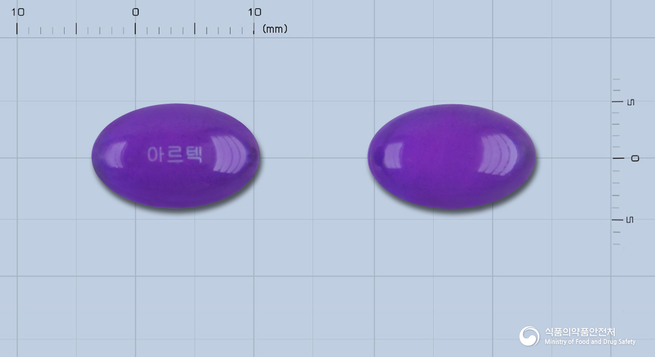 - 성상: 무색 내지 연보라색의 내용물이 든 보라색의 투명한 타원형 연질캡슐