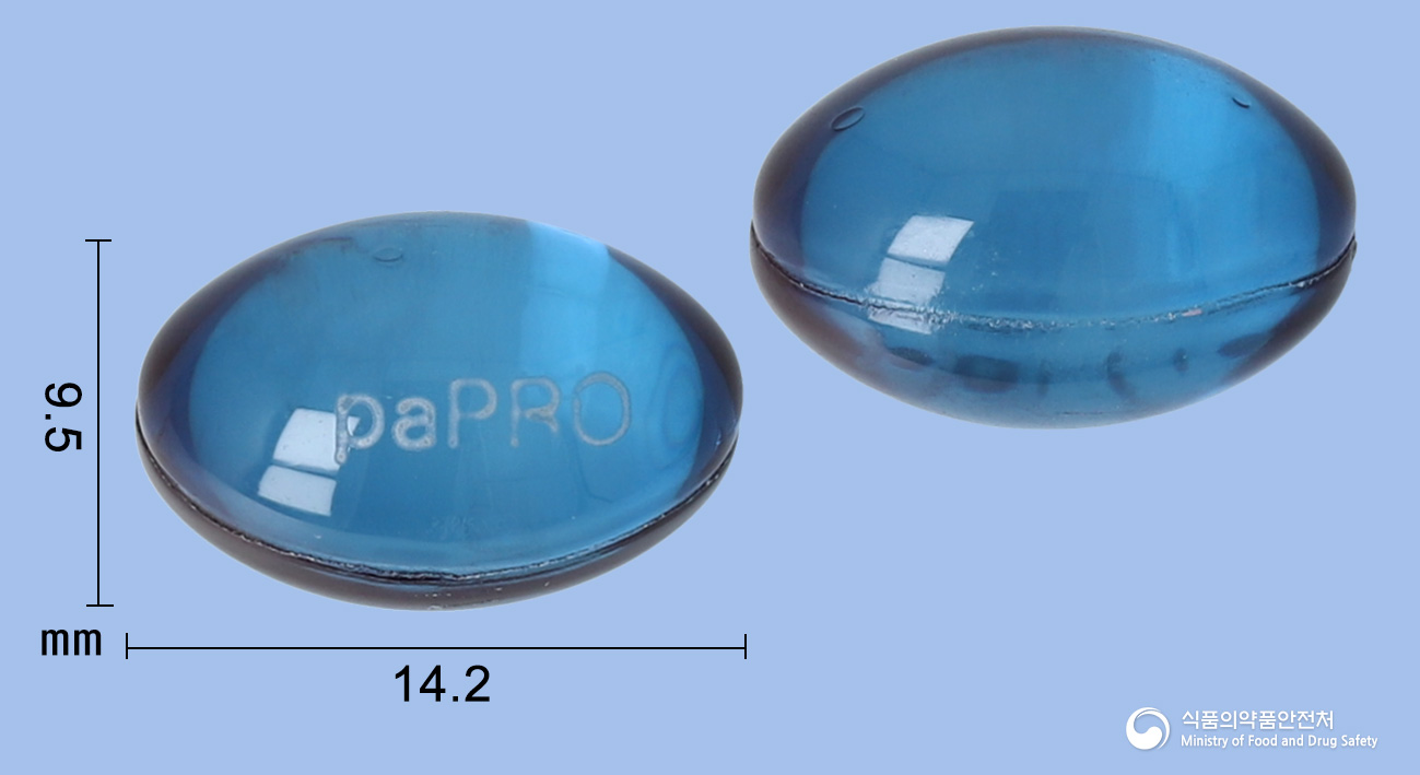 - 제형: 무색 내지 연한 청색의 투명한 내용물이 든 청색의 투명한 연질캡슐