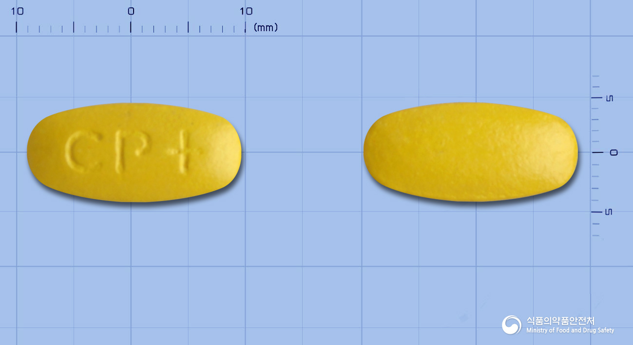 외형 정보: 비타제트플러스정은 노란색의 타원형 필름코팅정이며, ‘CP+’ 각인이 있습니다.