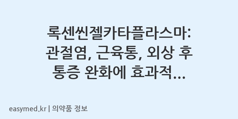 안녕하세요, 꼼꼼하고 전문적인 약사 블로거입니다. 오늘은 퇴행성관절염, 근육통, 외상 후 통증과 부종 완화에 사용되는 록소프로펜나트륨수화물 성분의 카타플라스마 제제인 록센씬젤카타플라스마에 대해 자세히 알아보겠습니다. 1일 1회 환부에 부착하는 외용제로, 사용 전 반드시 주의사항을 확인하세요.