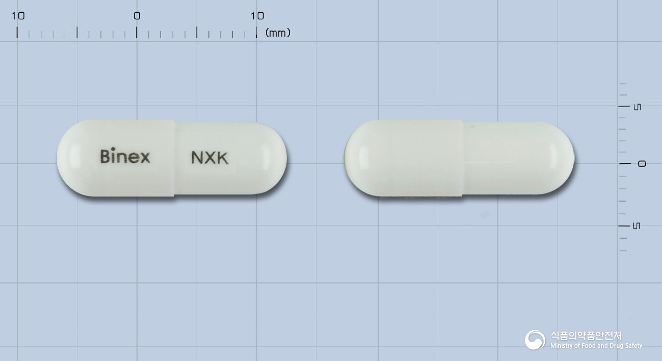 비스칸엔캡슐은 흰색의 분말이 든 상부 하부 흰색의 장방형 캡슐제입니다. 캡슐에는 ‘NXK’ 마크가 각인되어 있습니다.