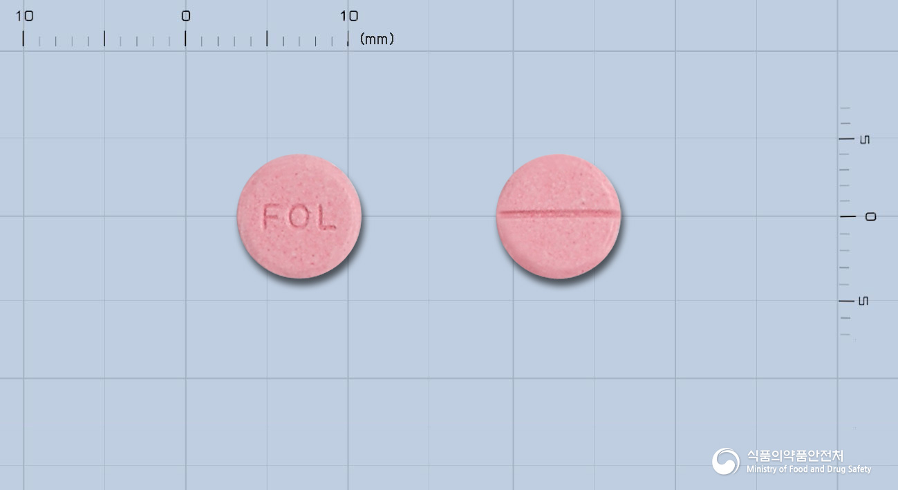 분홍색의 원형 정제이며, 앞면에는 ‘FOL’이라는 각인이 새겨져 있습니다.