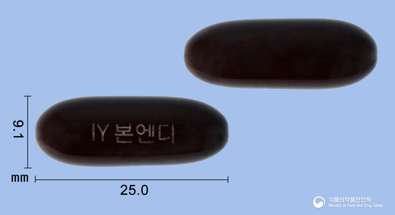 본엔디연질캡슐은 유백색의 유상(기름상태) 내용물을 함유한 암갈색의 장방형 연질캡슐입니다. 모양은 타원형이며, 색상은 갈색입니다. 캡슐에는 ‘IY 본엔디’가 각인되어 있습니다.