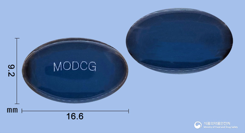 모드코프에스연질캡슐은 무색 내지 연한 청색의 내용물을 함유한 청색의 투명한 타원형 연질캡슐이며, ‘MODCG’ 각인이 되어 있습니다.