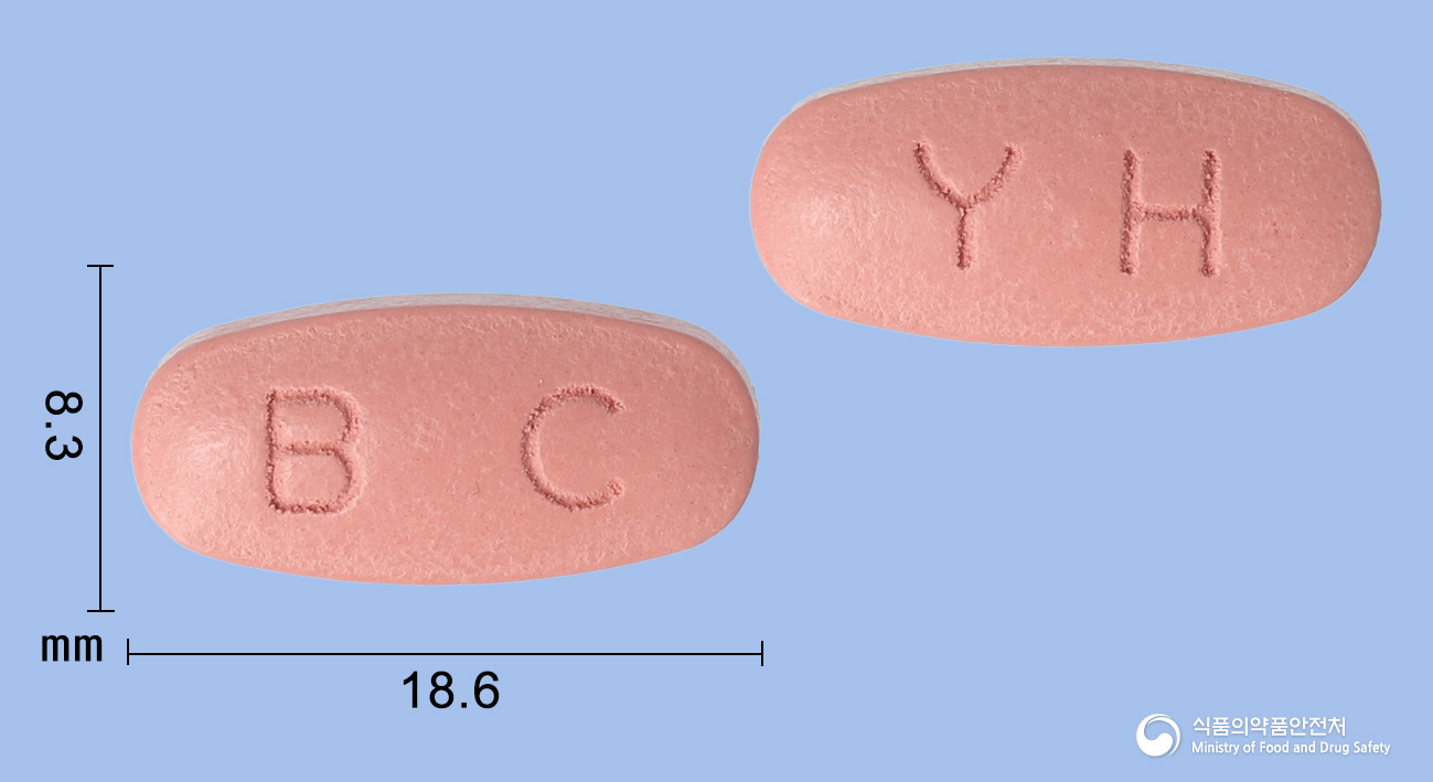 외형 정보: 삐콤씨정은 분홍색의 타원형 필름코팅정으로, ‘BC’ 각인이 새겨져 있습니다.