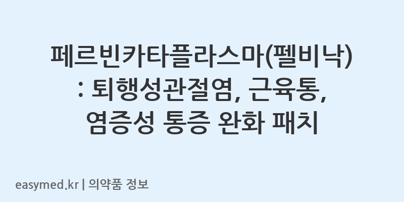 안녕하세요, 꼼꼼한 약사 블로거입니다. 오늘은 관절염, 근육통 등 다양한 염증성 통증에 효과적인 국소 진통소염 패치, 명문제약의 ‘페르빈카타플라스마(펠비낙)’에 대해 자세히 알아보겠습니다. 이 포스팅을 통해 이 약의 효능·효과, 올바른 용법·용량, 그리고 사용 시 꼭 알아야 할 주의사항들을 명확하게 이해하시고 안전하게 사용하시기를 바랍니다.