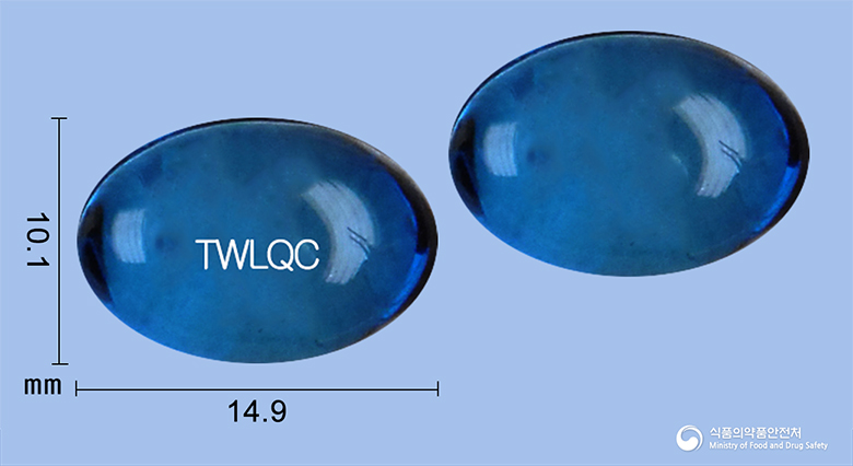 - 제형: 무색 내지 청색의 투명한 내용물을 함유한 청색의 투명한 연질캡슐