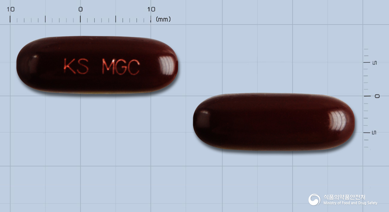 - 제형: 회백색의 유상내용물을 함유한 암갈색의 장방형 연질캡슐